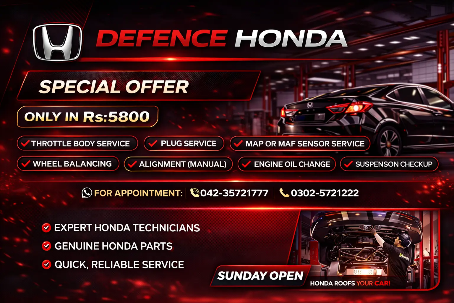 Get your car serviced by trusted experts at Defence Honda DHA Lahore with our exclusive Special Service Package